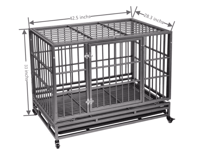 SpecificationsColor: BlackMaterial: Galvanized TubeOverall Dimensions: 42.5"L x 28.3"W x 33"HNet Weight: 50.70 lbsDoor Dimensions: 18.5"W x 19.6"HDistance Between Each Two Bars: 2.2"Wheels:Four (Two lockable)Comes with a plastic (PP material) tray that can be disassembled (slid out)The product can bear a weight of 330.69 lbs
