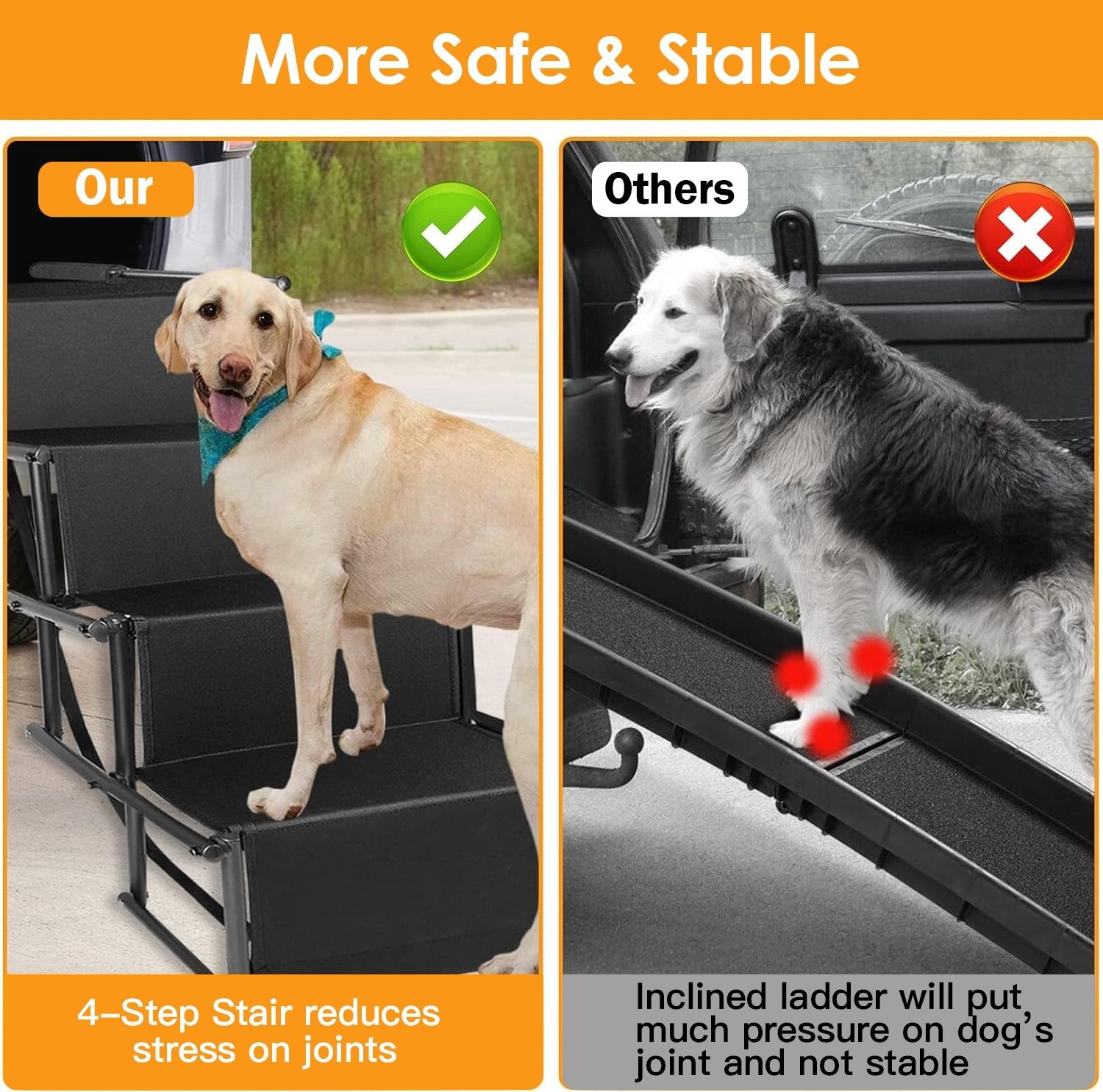 *Stable Pet Ladder for Car*:The slip resistant rubber foam pad attached to the dog stair handle makes the stairs steady and provides ultra safety for your pets on slippery places. Safety tether with the carabiner on tailgate latch offers double protectation for your dogs.