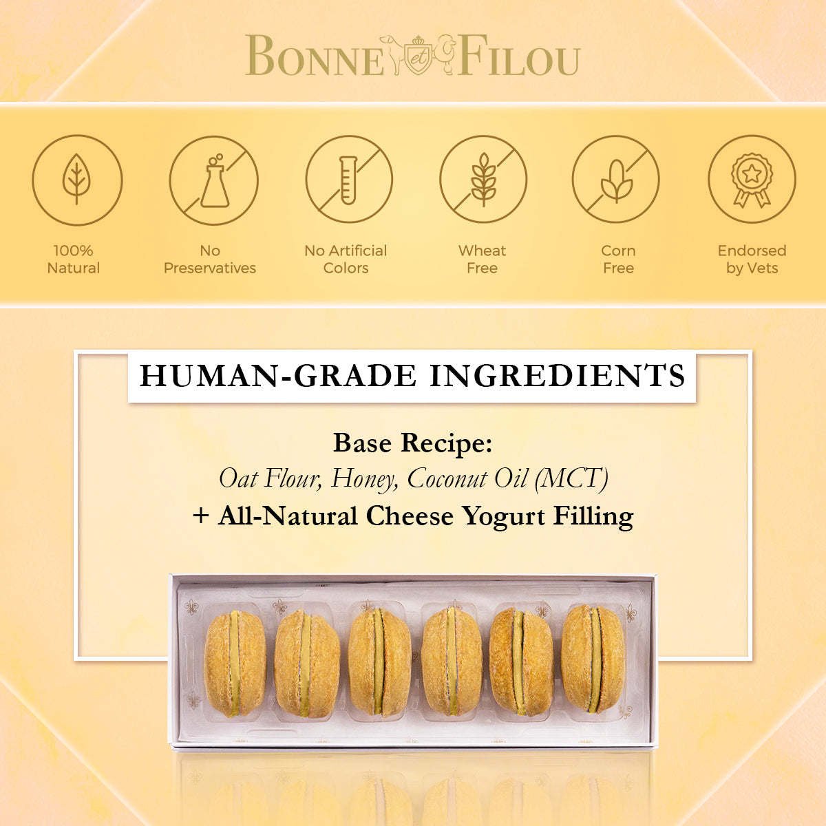 Dog Macarons - Count of 6 (Dog Treats | Dog Gifts)This box of our premium macaron treats features: - Box of 6 dog macarons- Handmade with premium human-grade ingredients in the USA- 100% natural; corn-free; wheat-free ingredients- No artificial coloring or preservatives- Hard treat designed for a long-lasting chew- Shelf life of 12+ months | No need for refrigerationBase Recipe Ingredients: Oat Flour; Honey; Coconut Oil; All-Natural Flavored Yogurt FillingFeeding Instructions:Our treats are hard; designed for a long-lasting chew. For elderly or small dogs; we recommend breaking the treat in smaller pieces (by twisting both sides).